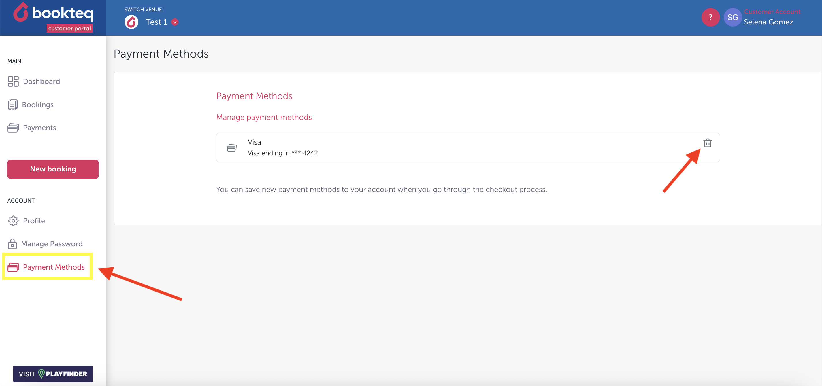 Your different payment methods are stored in the "Payment Methods" tab on the bar on the left-hand side.